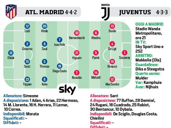 «L’Atletico è un avversario forte che può puntare a vincere la Champions. Lo conosco perché durante il precampionato lo abbiamo affrontato. In questo inizio di stagione ha fatto bene perché rispetto al passato è cresciuta come palleggio e come qualità tecnica dei centrocampisti senza però perdere il carattere del suo allenatore. Non sarà facile. Questo match può indirizzare il girone. Viene dopo un incontro dispendioso dal punto di vista fisico come quello contro la Fiorentina, ma ci faremo trovare pronti. Il nostro centrocampo non adatto al palleggio che voglio io? Non vorrei che Khedira e Matuidi fossero sottovalutati… E poi alle loro spalle ci sono giocatori come Ramsey e Rabiot che negli ultimi mesi però hanno giocato poco e vanno messi in condizione di dare il loro contributo. Lì in mezzo siamo completi: abbiamo sia spada che fioretto e possiamo sparare di tutto».