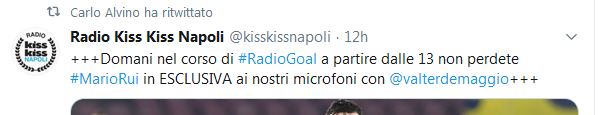 Oggi a partire dalle ore 13,00, in esclusiva su Radio Kiss Kiss il difensore Mario Rui risponderà alle domande dei colleghi della radio ufficiale.
