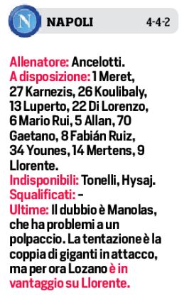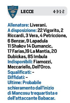 Domani pomeriggio alle ore 15,00, presso lo stadio “Via del Mare”, il Lecce di Fabio Liverani affronterà il Napoli, sfida valevole per la quarta giornata di campionato. I salentini dovranno fare a meno degli infortunati Dell’Orco, Maccariello e Fiamozzi, ma a livello tattico giocheranno con il 4-3-1-2, con Falco alle spalle di Babacar e Mancosu, quest’ultimo in vantaggio su Lapadula e Farias. Carlo Ancelotti invece farà turnover, come riporta il CdS, riposo per Koulibaly in difesa assieme a Di Lorenzo e Mario Rui. A centrocampo Elmas e Zielinski in vantaggio su Allan e Fabian Ruiz. Infine in attacco Milik dovrebbe partire dal primo minuto al fianco di Lozano.