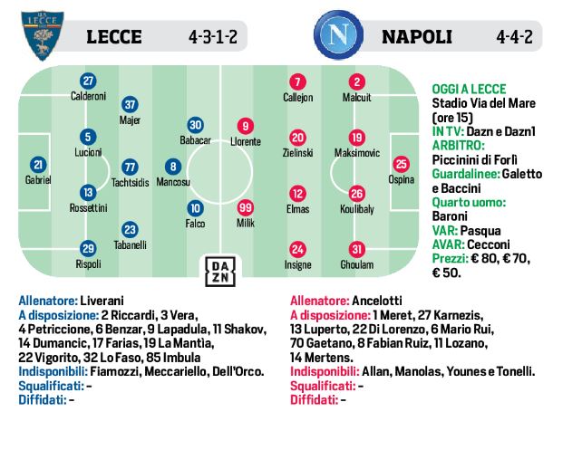 Questo pomeriggio allo stadio “Via del Mare”, il Lecce di Liverani affronterà il Napoli per la quarta giornata di campionato. I salenini punteranno sul fattore campo per sorprendere gli avversari e il tecnico ex Genoa manderà in campo una spregiudicata con Falco alle spalle di Mancosu e Babacar. Carlo Ancelotti invece farà ampio turnover, con Ospina, Malcuit, Maksimovic, Ghoulam, Zielinski, Elmas e il duo offensivo Llorente-Milik, per dar spazio a tutti. Il Napoli punterà al successo per tenere il passo di Inter e Juventus in classifica.
