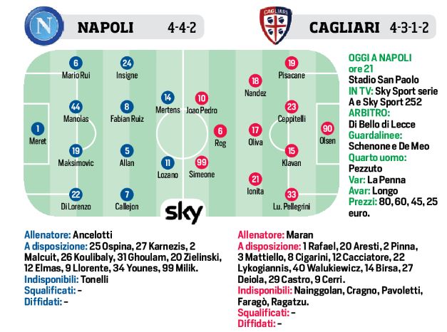 (Grafico formazioni) CdS – Napoli/Cagliari, Lozano al fianco di Mertens, per i sardi l’ex Rog