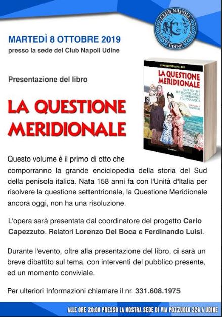 Martedì 8 ottobre prossimo, alle ore 20,00 circa, presso la sede del Club Napoli Udine, ci sarà la presentazione del libro “La Questione Meridionale”.