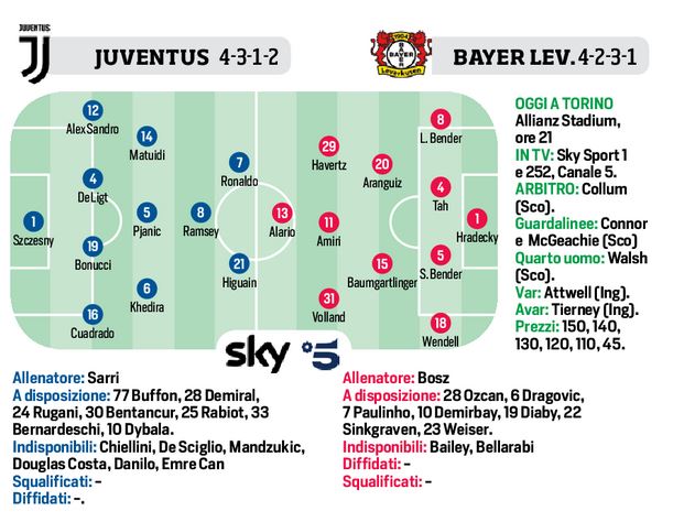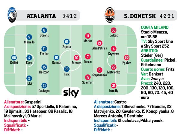Prima Atalanta/S. Donetsk alle 18,55 poi Juve contro Leverkusen alle 21. così in campo secondo il corriere dello sport