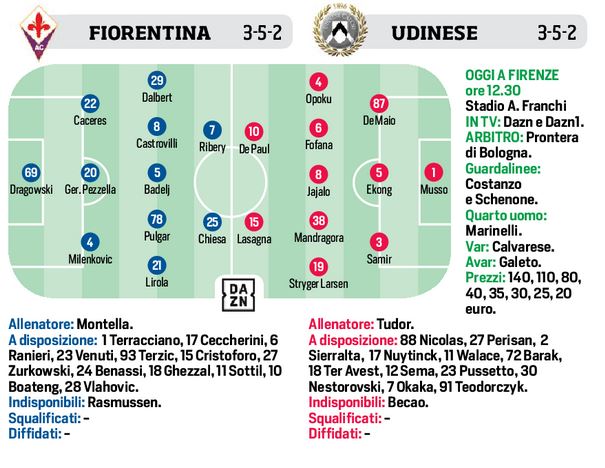 Serie A – Ore 12,30: Fiorentina/Udinese, le possibili formazioni del CdS