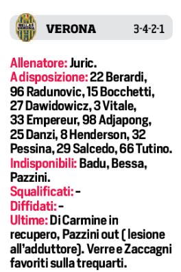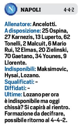 Il Napoli affronterà domani l’Hellas Verona, fischio d’inizio alle ore 18,00, in un San Paolo che potrebbe avere una buona cornice di pubblico. Il tecnico Carlo Ancelotti ha un paio di dubbi di formazione come il partner di Milik, uno tra Younes e Mertens e a centrocampo tra Fabian Ruiz e Zielinski, con lo spagnolo in leggero vantaggio. Il resto sarà il rientro di Koulibaly in difesa dalle due giornate di squalifica. Secondo il CdS il tecnico Juric punterà tutto su Stepinski in attacco e giocherà con la difesa a tre.