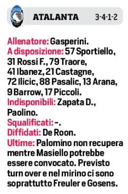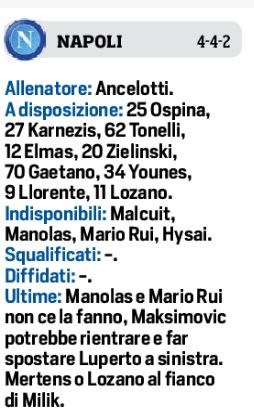 Domani alle ore 19,00 allo stadio San Paolo si giocherà il big-match valevole per il terzo posto in classifica. Il tecnico degli azzurri Carlo Ancelotti un paio di ballottaggi di formazione. A sinistra uno tra Luperto e Ghoulam con il primo in vantaggio e in attacco con Mertens o Lozano al fianco di Milik, con il belga favorito sul messicano. Per gli orobici invece Kjaer dovrebbe comporre il trio difensivo con Toloi e Djimsiti. Come trequartista invece Malinovski dietro Muriel e Gomez.