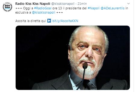 Oggi alle ore 13 il Presidente Aurelio de Laurentiis in radio parlerà di tutte ultime vicende di campo della squadra azzurra dopo la sconfitta contro la Roma e si analizzerà la sfida contro l’Austria Salisburgo di domani sera in Champions League. Ilnapolionline.com vi aggiornerà in tempo reale.