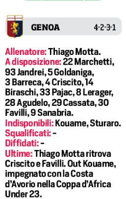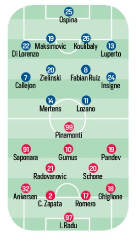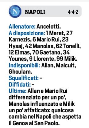 In un clima non semplice a Napoli c’è anche da pensare alla sfida di domani sera alle ore 20,45 al San Paolo contro il Genoa di Thiago Motta. Mister Carlo Ancelotti sta pensando ad alcuni cambi, non a stravolgimenti come riporta il CdS, come ad esempio Ospina tra i pali e Luperto al posto di Mario Rui. Per il resto l’attacco sarà composto ancora da Mertens e Lozano. Per i liguri invece sarà 4-2-3-1 con Pandev al posto del partente in nazionale Kouamè e Pinamonti di punta. A centrocampo infine ballottaggio Radovanovic-Cassata per affiancare Shoene.