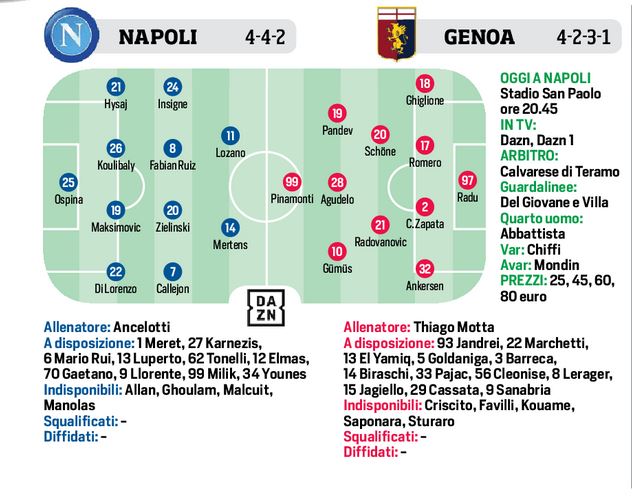Questa sera allo stadio San Paolo, con fischio d’inizio alle ore 20,45, il Napoli cercherà un successo scaccia-crisi contro il Genoa e per riscattarsi agli occhi dei tifosi dopo l’ammutinamento post Salisburgo. In vista della gara contro i ragazzi di Thiago Motta verrà confermato l’attacco Mertens-Lozano, come conferma il CdS, ma le novità saranno Ospina in porta e Hysaj sul lato sinistro. Per i liguri invece 5 assenze, compresa quella di Saponara, quindi si punterà sul giovane Pinamonti e sull’esperienza dell’ex Pandev per colpire la difesa partenopea. Ballottaggio a centrocampo Radovanovic-Cassata.