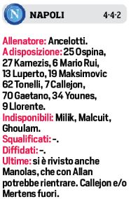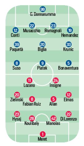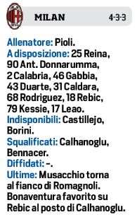 Domani pomeriggio alle ore 18,00 allo stadio “G. Meazza” di Milano, i padroni di casa rossoneri di Pioli affronteranno il Napoli, in una gara dove i tre punti darebbero la svolta ad una delle due compagini. L’allenatore del Milan ha un paio di dubbi di formazione, ma secondo il Corriere dello Sport, sta pensando la carta Bonaventura in avanti al fianco di Piatek e Suso. Per il resto assente per squalifica Bennacer, al suo posto Biglia, con Krunic in vantaggio su Kessie. In difesa ritorno di Musacchio al fianco di Romagnoli, Conti e Hernadez sugli esterni di difesa. In casa partenopea non è da escludere l’esclusione di Callejon e Mertens dal primo minuto, con Insigne e Lozano in avanti, mentre sugli esterni Elmas e Zielinski. Insomma un 4-4-2 più robusto per reggere i rossoneri e giocare di rimessa.