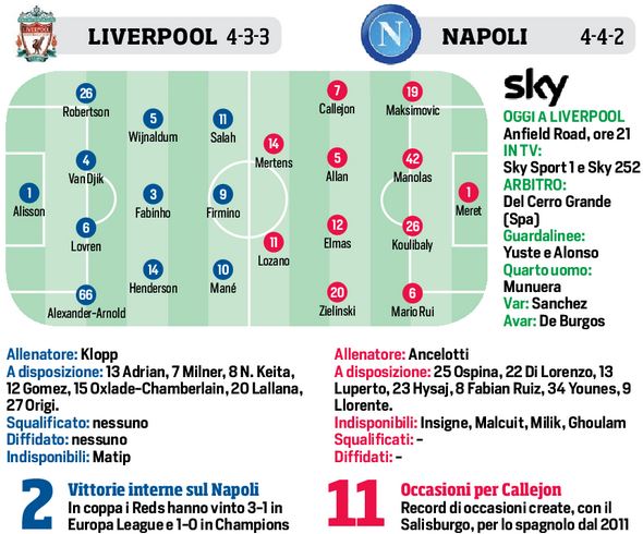 Questa sera ad Anfield Road, il Napoli cercherà di staccare in anticipo il pass per gli ottavi di finale contro i padroni di casa del Liverpool. I “reds” allenati da Jurgen Klopp recuperano in attacco Mohamed Salah che affiancherà il tridente composto da Manè e Firmino. A centrocampo il dubbio è tra Wijanldum e Milner, mentre come terzino destro Robertson sarà regolarmente in campo. Per quanto riguarda gli azzurri il ballottaggio sarò tra Maksimovic e Di Lorenzo a destra, con il serbo in leggero vantaggio. A centrocampo infine Fabian Ruiz è in panchina con Elmas al suo posto.