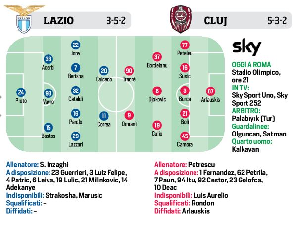 Ore 21 – “E.L.”: Lazio/Cluj, le possibili formazioni secondo Il CdS