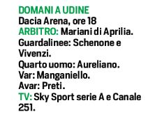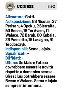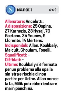Domani pomeriggio alla “Dacia Arena”, con fischio d’inizio alle ore 18,00, si giocherà Udinese-Napoli, una sfida che vale tanto per entrambe le compagini. I padroni di casa, come riporta il CdS, dovranno fare a meno degli infortunati Sema e Jajalo, il tecnico Gotti giocherà con il 3-5-2. Dubbio in attacco tra Okaka e Lasagna assieme a Nestoroski. Per mister Ancelotti invece scelte obbligate, visto anche l’infortunio alla spalla a Koulibaly, out anche Allan e i lungodegenti Tonelli e Ghoulam. A centrocampo rientrerà Callejon a destra, con Elmas spostato a sinistra. In attacco infine il duo Insigne-Lozano, con Mertens e Llorente che scalpitano, mentre per Milik si deciderà oggi alla rifinitura.