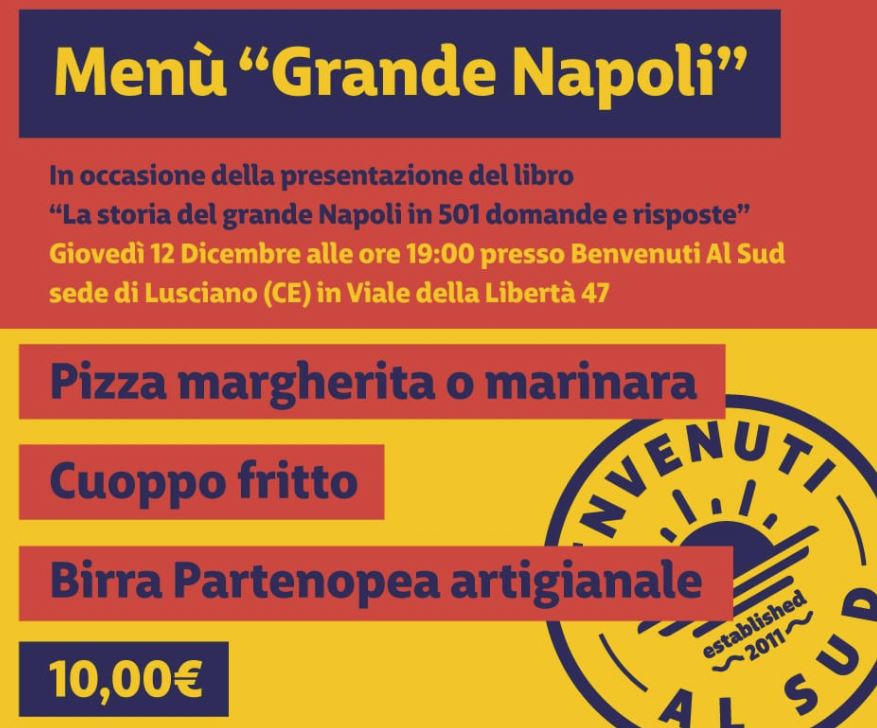 Appuntamento dunque da non perdere: giovedì 12 dicembre, alle ore 19, presso «Benvenuti al Sud», con Bruscolotti, Casale, D’Angiò, Cesarano, Gifuni e gli autori per parlare del Napoli e della presentazione del libro «La storia del grande Napoli in 501 domande e risposte» gustando, e, se si vuole, per gustarsi una vera pizza napoletana.