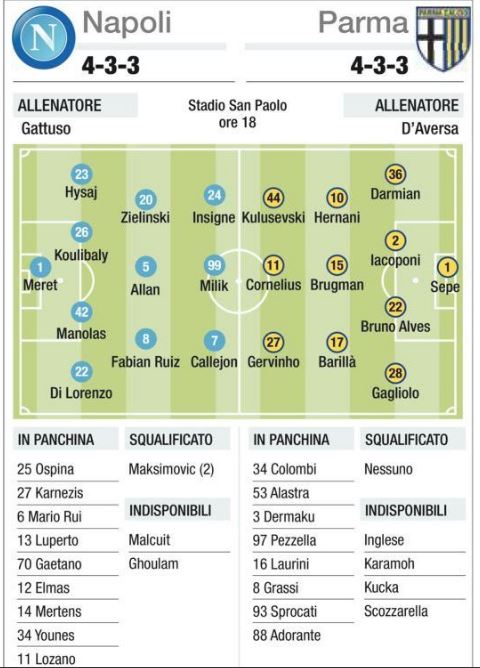 Napoli/Parma (Grafico form.) – Rino Gattuso riparte da Lorenzo Insigne