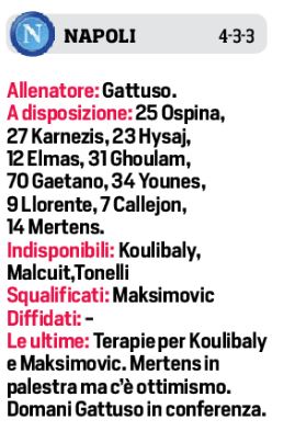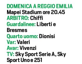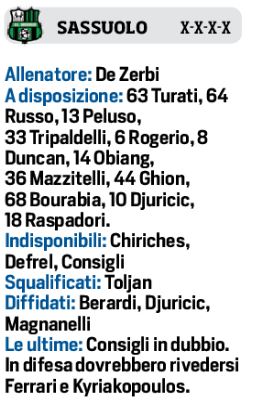 Domenica alle ore 20,45 al “Mapei Stadium”, i padroni di casa del Sassuolo affronteranno il Napoli, sfida davvero interessante tra le due compagini. Il tecnico dei neroverdi De Zerbi recupera i due infortunati Magnanelli e Berardi, con la conferma di Traorè nei tre trequartisti con Caputo in attacco. In porta Pegolo se non dovesse recuperare Consigli. Per quanto riguarda Gattuso, punterà su Lozano al posto di Callejon, Milik e Insigne gli altri due attaccanti. C’è da sottolineare il rientro di Ghoulam tra i convocati, anche se partirà dalla panchina, favorito Mario Rui.
