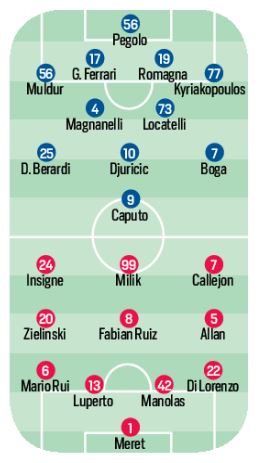 CENTROCAMPO – In vista della sfida contro il Sassuolo in cabina di regia questa volta, il tecnico Gattuso dovrebbe puntare sullo spagnolo Fabian Ruiz, con Allan e Zielinski ai lati. Elmas e Gaetano partiranno dalla panchina, pronti all’uso se fosse necessario.
