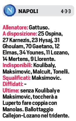 DIFESA – Il tecnico Gattuso per il reparto arretrato ha scelte obbligate, soprattutto al centro, con Manolas e Luperto, viste le assenze per infortunio di Koulibaly e Maksimovic. Sulle corsie laterali Di Lorenzo e Mario Rui, con Ghoulam pronto all’uso.
