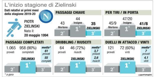 Piotr Zielisnki si è calato nella parte, ha abbandonato il ruolo di mezzala, ha abbassato il suo baricentro rispetto alla posizione di trequartista occupata in Nazionale, per virare in un punto del terreno di gioco mai occupato in precedenza. In questa posizione del 4-4-2, molto più vicino alla propria area di rigore che a quella avversaria, ha avuto anche compiti difensivi più stringenti: il solo gol realizzato in stagione a fronte di un minutaggio cospicuo e con la presenza (da titolare o subentrato) in campo in 22 delle 23 gare giocate finora dal Napoli in stagione. Fonte: Il Mattino