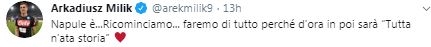 Arek cita Pino. Nel giorno del quinto anniversario della morte di Pino Daniele, scomparso il 4 gennaio 2015, Milik ha deciso di dedicare un omaggio al cantautore napoletano che sa tanto di carica per la squadra in vista dell’Inter. Ovvero: