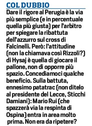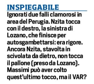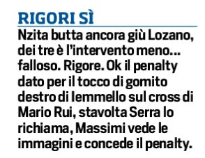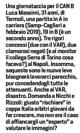 Giornata da dimenticare per il giovane arbitro di Can B Luca Massimi di Termoli per la prestazione di Napoli-Perugia, valevole per gli ottavi di Coppa Italia. Il VAR non lo aiuta in occasione di un contatto tra Nzita e Lozano. Ok in occasione del primo rigore tra il contatto tra gli stessi protagonisti, mentre come riporta il CdS, la tecnologia è di aiuto all’arbitro in occasione del mani di Iemmello sul cross di Mario Rui. Sul penalty assegnato al Perugia, Massimi si è mostrato titubante, anche perchè Hysaj non è sembrato andare incontro al braccio verso il pallone. L’errore semmai è che il penalty doveva essere ripetuto visto che Mario Rui era entrato prima in area. Insomma una prestazione da dimenticare.