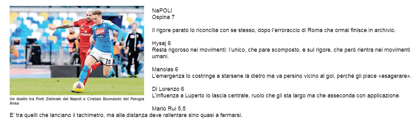 Il Napoli conquista i quarti di finale di Coppa Italia, battendo per 2-0 il Perugia. Le due marcature entrambe sono con Lorenzo Insigne, ed entrambe sono su calcio di rigore, trasformati con freddezza dal capitano degli azzurri. Per il resto partita quasi in controllo, se si esclude il penalty parato da Ospina su Iemmello a fine primo tempo. Debutto di Demme con recuperi interessanti a centrocampo. Le pagelle del Cds non danno la sufficienza a Mario Rui, Fabian Ruiz e Llorente