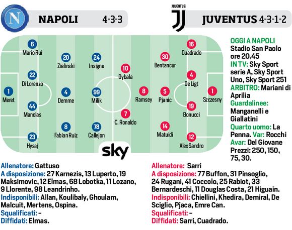 Ieri pomeriggio Gattuso ha ricevuto una notizia buona e una cattiva. La positiva è il recupero di Maksimovic per la lista convocati, anche se partirà dalla panchina, quella negativa è la gastroenterite di Ospina. Il portiere colombiano, secondo il Corriere dello Sport, molto probabilmente non sarà neanche in panchina, al suo posto tornerà tra i pali Meret. Il resto dell’undici degli azzurri c’è un solo dubbio a centrocampo, chi tra Lobotka e Fabian Ruiz nel terzetto della mediana, con lo spagnolo avanti rispetto allo slovacco. La Juventus invece non rischierà il tridente pesante, probabile Dybala e non Higuain assieme a Cristiano Ronaldo, con alle spalle Ramsey. A centrocampo ballottaggio Matuidi–Rabiot con il primo in leggero vantaggio.