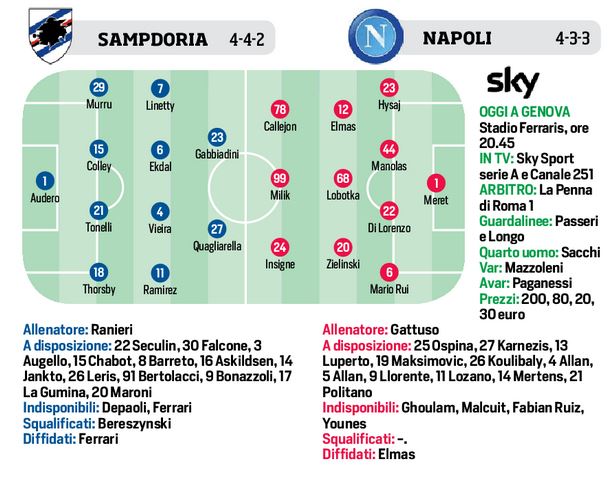 Questa sera allo stadio “Marassi” di Genova, con fischio d’inizio alle ore 20,45, i padroni di casa della Sampdoria affronteranno il Napoli per la terza di ritorno. I liguri giocheranno con il 4-4-2, chiudere i varchi e giocare di rimessa con il duo Quagliarella-Gabbiadini là in avanti. Sugli esterni Ramirez e il polacco Linetty, mentre in difesa il terzo ex Tonelli con Colley. Gattuso invece molto probabilmente dovrà fare a meno di Demme, partito da solo a causa della febbre, con Lobotka pronto a fare il regista assieme ad Elmas e Zielinski. Dubbio in difesa con Hysaj e Maksimovic, favorito l’albanese sulla destra. Con un successo gli azzurri si avvicinerebbero alla zona Europa League, quindi sarà battaglia contro l’undici di Ranieri, ma servono punti.