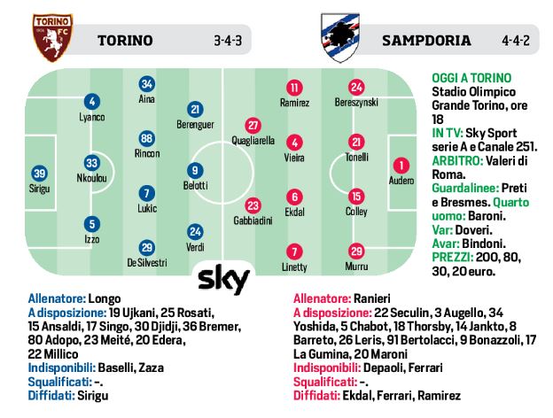 Due squadre che dopo le ultime sconfitte e il cambio in panca del Torino vogliono dare una svolta al campionato. così in campo per il CdS
