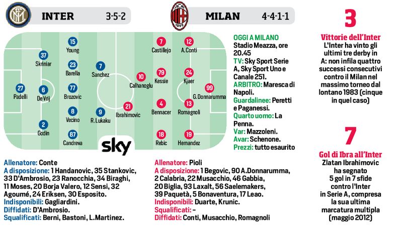 Ore 20,45 – Inter/Milan, le probabili formazioni le dà il CdS
