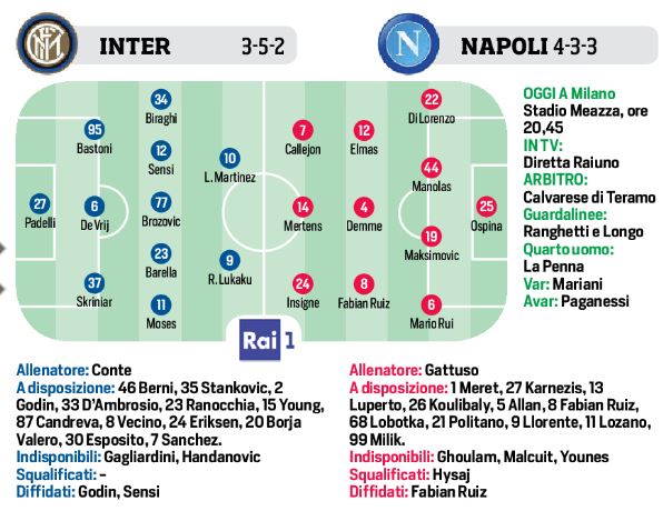 Questa sera a San Siro si giocherà la partita d’andata di Coppa Italia valevole per la semifinale tra l’Inter e il Napoli. I nerazzurri cercheranno conferme dopo l’ottimo secondo tempo contro il Milan e per l’occasione punteranno sul duo d’attacco Lukaku Lautaro, con il belga in ballottaggio su Alexis Sanchez. Per il resto sulle fasce Biraghi e Moses, mentre in difesa Bastoni al posto di Godin. Per gli azzurri invece può essere la partita del riscatto dopo la sconfitta contro il Lecce. In difesa rientra Manolas, al suo fianco Maksimovic. In porta ancora Ospina viste le non perfette condizioni di Meret. A centrocampo Elmas in vantaggio su Allan con Demme e Fabian. Infine l’attacco leggero: Callejon, Mertens e Insigne.