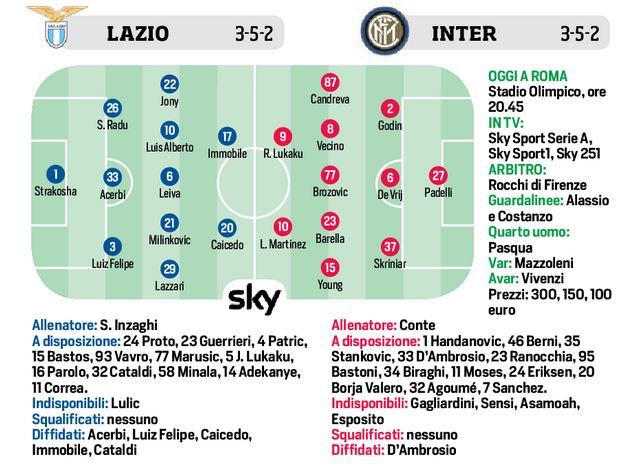 Ore 20,45 Lazio/Inter, si decide l’anti Juve. Le possibili formazioni