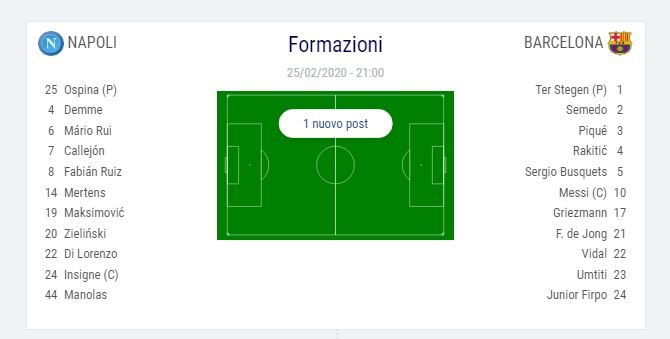 Questa sera alle ore 21,00 allo stadio San Paolo, si giocherà il match d’andata tra il Napoli e il Barcellona per gli ottavi di Champions League. Una sfida molto sentita in città per l’arrivo di Messi, tra i migliori al mondo e di una squadra con tanti campioni in organico. Gli azzurri cercheranno con tutte le loro forze di regalare una notte magica ai suoi tifosi e si preannuncia una cornice di pubblico di alto livello. Ilnapolionline.com vi informerà in tempo reale anche per questo importante evento.