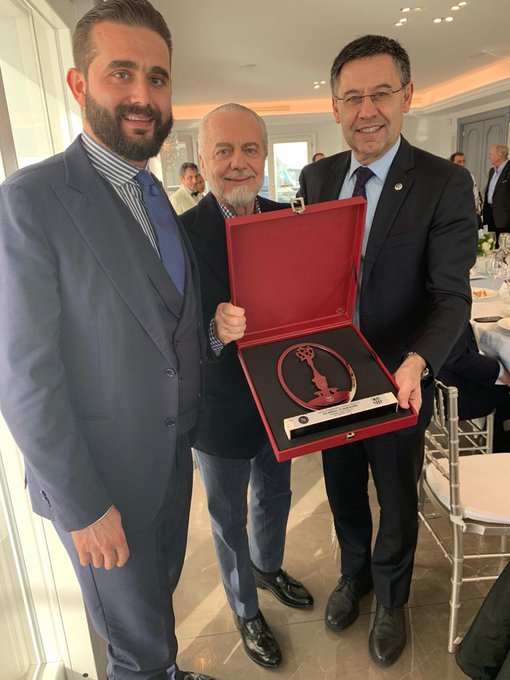 Alla fine del caratteristico pranzo Uefa con i rappresentanti e il Barcellona c’è stato lo scambio di doni tra De Laurentiis e il presidente del Barcellona Josep Maria Bartomeu