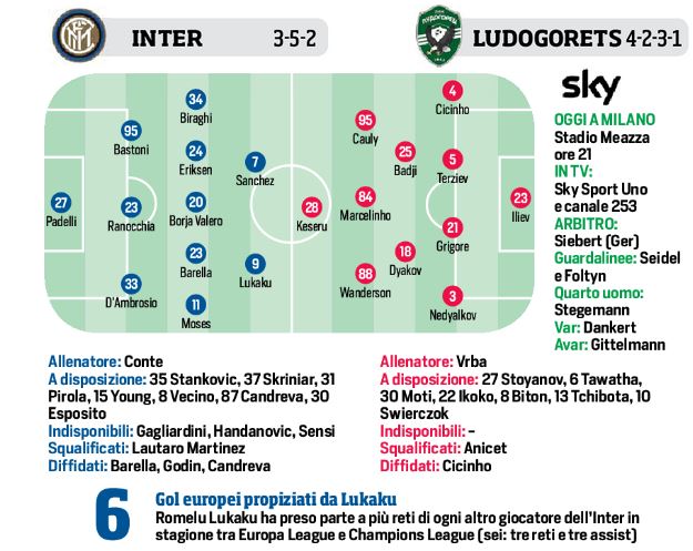 Con la vittoria in trasferta per 0-2, l’Inter non dovrebbe correre nessun rischio contro il Ludogorets. Così in campo per il CdS: