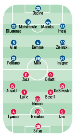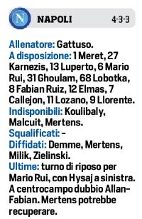 C’è un ballottaggio sulla sinistra. Hysaj o Ghoulam per far riposare Mario Rui nella logica del turnover. Il laterale albanese sarebbe favorito rispetto al franco-algerino, mentre gli altri elementi sono: Di Lorenzo, Maksimovic e Manolas . Il Corriere dello Sport odierno mette in evidenza che potrebbe rientrare dal primo minuto Allan per far riposare Fabian Ruiz. Per il resto un altro ballottaggio sarà nel ruolo di regista davanti alla difesa con Demme ancora avanti rispetto a Lobotka.Callejon con staffetta con PolitanoMilik al centro dell’attacco e Insigne per cercare di sfondare il muro difensivo del Torino.