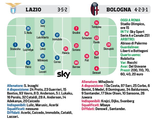 La vittoria alla Lazio le consentirebbe di stare momentaneamente sola al primo posto. Il Bologna ha voglia di riscatto dopo aver raccolto solo un punto nelle ultime due sfide (pareggio contro l’Udinese e sconfitta contro il Genoa). Inzaghi avrebbe scelto la coppia Immobile-Correa, mentre Mihajlovic (193 presenze 33 goal in maglia biancoceleste con 1 Scudetto, 2 Coppe Italia e 2 Supercoppe Italiane, 1 Coppa delle Coppe e una Supercoppa Europea da giocatore) si affiderebbe al trio Barrow-Orsolini-Soriano dietro l’intramontabile Palacio.