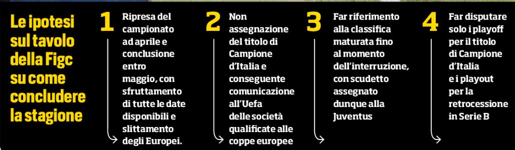 E’ considerata un’extrema ratio, ma se l’Europeo slitterà a luglio-agosto-settembre o (ancora meglio) al 2021, le date per concludere la stagione ci sarebbero. Per questo la posizione della Lega sarà quella di chiedere un aiuto a Nyon per assegnare il titolo del 2019-20. Anche la Federazione è pronta a recitare la sua parte.