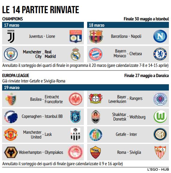 Cosi come ha comunicato la UEFA ,tutte le gare in programma di Champions ed Europa League sono sospese .Tra queste anche le gare il ritorno di Napoli e Juventus.