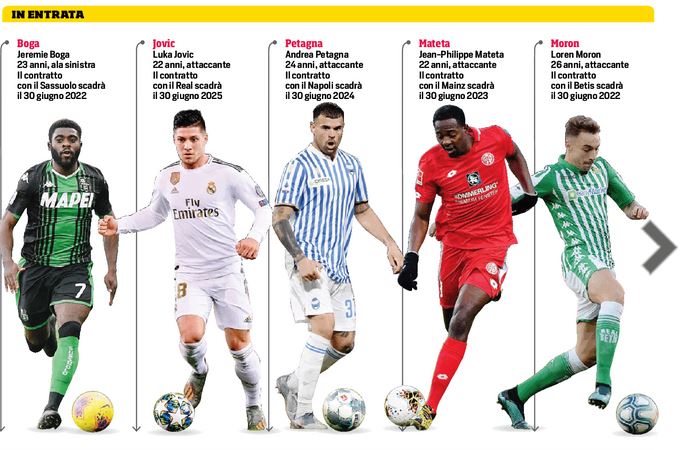 Petagna già è un calciatore del Napoli ma ecco quali sono gli altri obiettivi del club partenopeo: Boga (Sassuolo), Jovic (Real Madrid), Mateta (Magonza) e Loren (Betis). Tra i partenti sicuramente Llorente, ma non è da sottovalutare la situazione legata a Milik. Motivo per cui “l’esubero” madridista Jovic potrebbe essere una possibilità in caso di addio del 99 polacco.