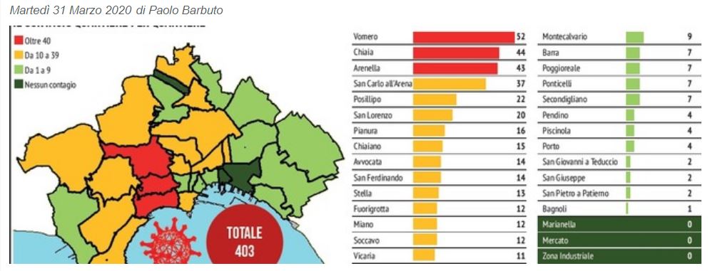 Insomma, i quartieri della borghesia avrebbero maggiori opportunità di interazione, secondo l’infettivologa Triassi: «Diciamo un ventaglio più ampio di interazioni. Perché in tutti i quartieri c’è la tendenza a incontrarsi, a stare assieme. Ma se si incontrano sempre le stesse persone, le possibilità di contagio diminuiscono. Crescono, invece, quando il numero di incontri si amplia».Tre i quartieri maggiormente aggrediti, di converso tre quelli dove fortunatamente non si è registrato nemmeno un caso di contagio: Mercato, Marianella e Zona Industriale.