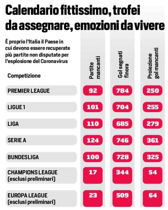 Quando e se si riprenderà…Il calcio aspetta di poter tornare in campo, ma la cosa sarà fatto solo se la salute di tutti potrà essere garantita. E, siccome l’Italia è uno dei paesi europei in cui l’epidemia Coronavirus è esplosa prima, è proprio nel bel Paese che c’è il numero maggiore di gare da dover recuperare. Ma dappertutto c’è tantissimo da recuperare…Basta dare un’ occhiata…