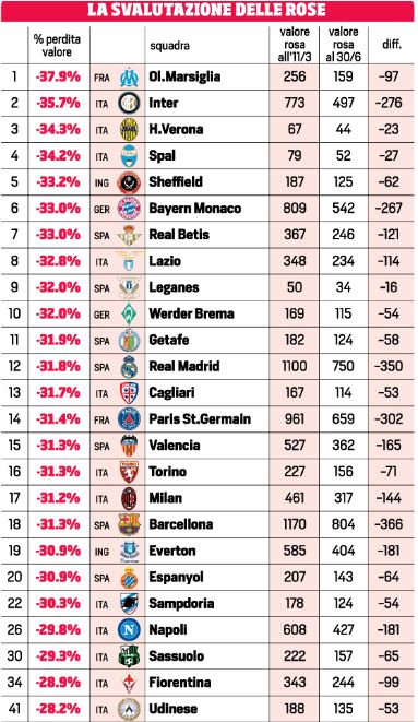 Un recente studio dell’osservatorio calcistico CIES sui principali campionati dell’Eurozona. Il grafico (Premier League, Bundesliga, Liga, Serie A e Ligue1) non lascia dubbi sui futuri scenari che proprietà e direzioni sportive dovranno affrontare nei prossimi mesi. Si prevede infatti un calo medio delle “rose” pari al 28%. Il Napoli perderebbe 181 milioni.