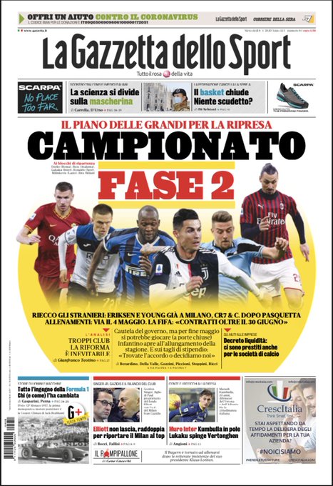 NewsCalcioIn Evidenza Rassegna stampa 8 aprile. Prime pagine sportive nazionali By Giuseppe Sacco il Apr 8, 2020 - 07:45:28 0 Condividi Factory della Comunicazione Dall’odierna rassegna stampa ecco in primo piano le pagine sportive nazionali CalcioNapoliPagineprime 0 Condividi FacebookTwitterGoogle+ReddItWhatsAppPinterestE-mail