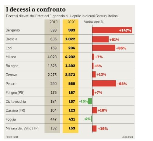 L’Istat aggiunge un’altra notazione: nei mesi di gennaio e febbraio la mortalità generale era risultata più o meno in tutta Italia più bassa del previsto, a causa di un inverno meno rigido e di un’influenza non particolarmente aggressiva. Questo fa sì che anche in diversi centri in cui da marzo in poi c’è stato un aumento visibile dei decessi, il totale da inizio anno possa risultare invece in calo. Ed anche a Bergamo – ad esempio – l’incremento del 2020 (fino al 4 aprile) rispetto al 2019 risulta molto significativo (+147%) ma inferiore rispetto a quello dirompente rilevato dopo l’insorgere dell’epidemia. Fonte: Il Mattino
