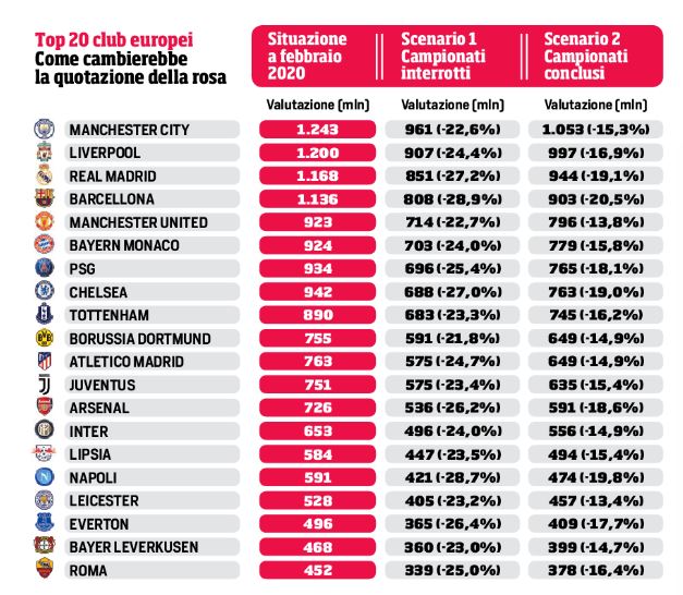 La sospensione o lo stop definitivo del campionato cambierà molte cose, soprattutto in sede di mercato. I grandi club, e non solo, rischiano ingenti perdite che comprometteranno le casse societarie. Dei 4 club “Miliardari” (City, Liverpool, Real e Barça) le perdite si aggirerebbero 200 e i 300 milioni di euro se il campionato venisse interrotto e sui circa 200 se la stagione si concludesse. I top 20 club europei rischiano una perdita media del 22,42% se i tornei nazionali non si dovessero concludere. Mentre portando a termine i campionati si limiterebbero i danni con un passivo medio di 16,54%.