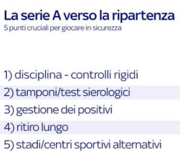 Cinque punti, cinque aspetti cruciali per poter pensare alla ripresa del campionato. I giocatori hanno rincominciato ad allenarsi, seppur in forma individuale. Nella settimana decisiva del calcio italiano, il prossimo step è la ripresa delle sedute collettive. Diversi i punti fondamentali per garantire sicurezze, che vanno dal senso di responsabilità di tutti i protagonisti agli aspetti sanitari.