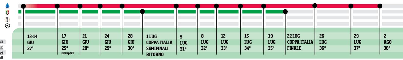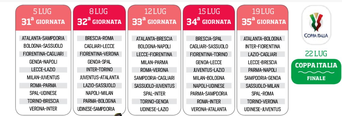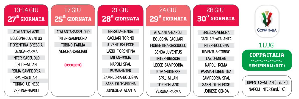 In attesa di conoscere il parere del Governo sul ritorno al calcio giocato, ieri pomeriggio con un comunicato la Lega calcio ha fatto sapere le possibili date della serie A e della Coppa Italia. Il 13 Giugno si partirebbe con la ventisettesima giornata. Il primo Luglio le gare di ritorno di Coppa Italia e il 22 Luglio la finale che si disputerà a Roma. Ovviamente questo con il benestare del Governo di Giuseppe Conte e del CTS.