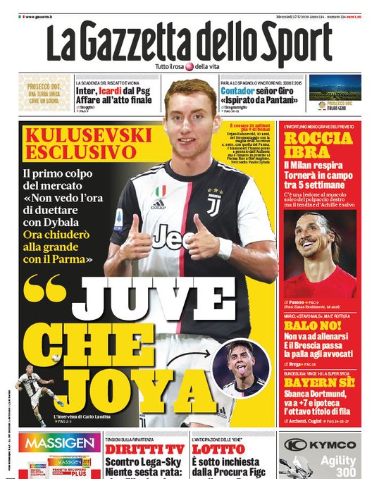 Il primo colpo di mercato della Juve. Le sue parole: “Non vedo l’ora di duettare con Dybala. Ora chiuderò alla grande con il Parma”. Così in prima pagina sulla Gazzetta dello sport, mentre Tuttosport titola “Juve 11 sul mercato”