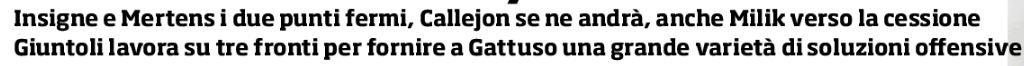e che non verranno disattese: silenziosamente, il Napoli si ricostruirà «dentro», in attacco soprattutto, cambiando facce, e anche tante, però restando fondamentalmente se stesso. Si ripartirà dal 4-3-3 (o dal 4-1-4-1 che in qualcosa gli somiglia), ma questo è persino un dettaglio che evapora tra le certezze, insolite di questi tempi: Callejon tornerà in Patria, Milik ascolterà Vecchie Signore e corteggiatrici sparse, consapevole di non aver altra scelta, o rinnova o dovrà sopportare un (altro) anno duro, avendo Mertens davanti a sé e quindi un posto già occupato e prenotato. Ma si procederà anche non separazioni più o meno consensuali, come quella con Younes che ha «tradito»; e Lozano che ha deluso rimarrà a guardar ciò che suggerirà quest’estate, in cui si dovrà anche giocare per scorgere un orizzonte e definirselo da soli. Fonte: CdS